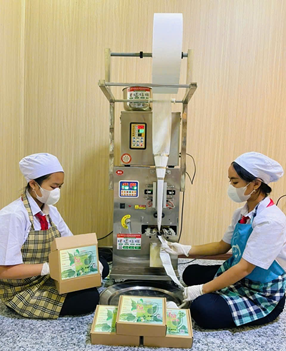 Sau khi hoàn tất các công đoạn chế biến, nguyên liệu trà được nghiền thô và phối trộn theo tỷ lệ phù hợp. Mỗi túi trà đều được cân định lượng cẩn thận để đảm bảo khi pha có hương vị ổn định, không quá nhạt cũng không quá đậm.
